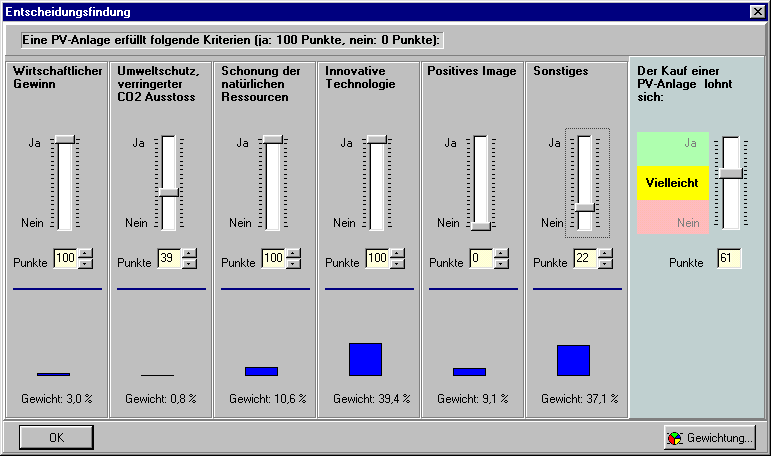 den eine PV-Anlage (ähnlich z.B. dem Erwerb eines Sportwagens) bringt. Allen diese Kriterien kann jeweils ein Gewicht zugeordent werden. Je höher die Gewichtung eines Kriteriums, desto stärker geht dessen Beurteilung in das Ergebnis mit ein.