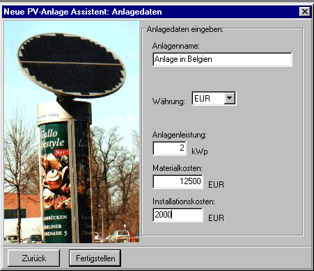 - Anlagenname- Währung in der die Anlage berechnet werden soll- Leistung der Anlage - Kosten der Anlage